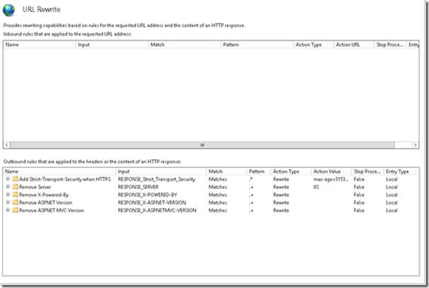In order to get started, I needed to download the “URL Rewrite” module for IIS, then create a few outbound rules. The resulting web.config file were then checked in to TFS and ready to be used when deploying to a different environment (e.g.: UAT). Below the rules created in IIS, as well as the generated config file with these rules