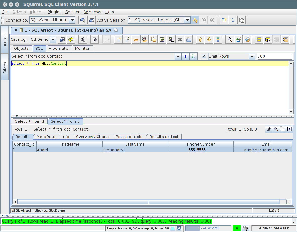 And this one depicts SQuirreL querying the demo database via SQL Server’s JDBC driver. I had to use ODBC instead of the JDBC driver, because the latter is Java based (it’s a jar file) which might’ve required me to host the JVM and use JNI and that’s not the scope or purpose of the application. I’ll publish the solution in its entirety once I’ve completed it.