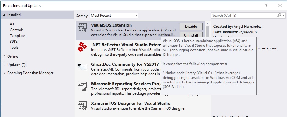 Visual SOS is both an executable and extension for Visual Studio that leverages the debugger engine available in Windows in conjunction with SOS debugging extension. It’s similar to having Windbg embedded into Visual Studio but in a much simpler way, because it exposes some of the most commonly used commands just a click away. Visual Studio debugger is a great tool but it lacks some options that are available in SOS only.