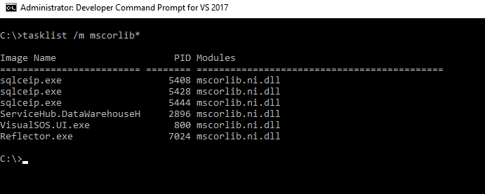 Visual SOS supports managed code debugging only and that’s its purpose. Said that, instead of writing a query on Process.GetProcesses() which it’s slow and most times throws exceptions when trying to inspect some processes (such as access denied, for instance), there is a better, faster way to determine what managed applications are running. This is done via tasklist command by specifying the module that contains the CLR (mscorlib).