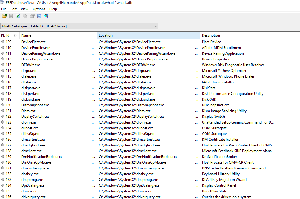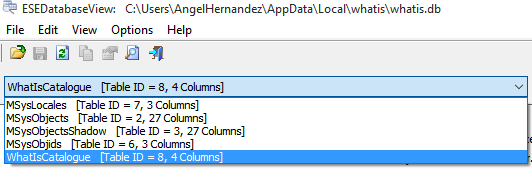 There’s one tool I use every time I have to work with an ESENT database. It’s free, awesome and lightweight and that’s ESEDatabaseView by NirSoft. The image depicted below show the objects in my whatis database