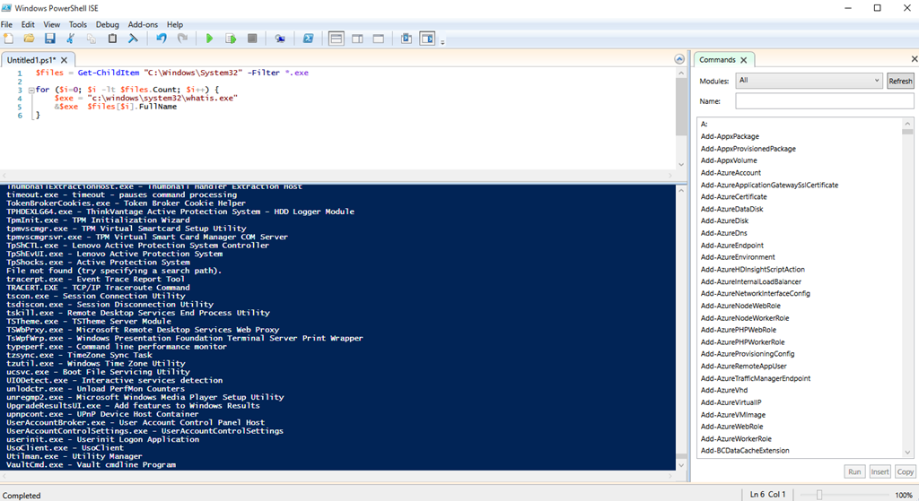The following script retrieves all the executable images in System32, loops through the collection and with every iteration it adds the file information to whatis.db